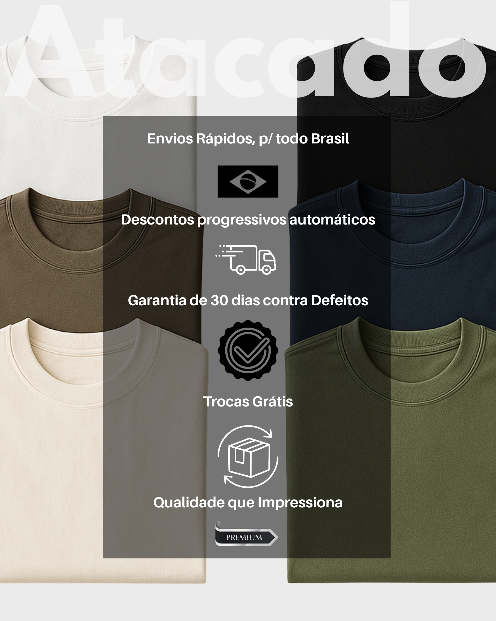 100% Algodão Penteado com reforço ombro a ombro e estabilização industrial.
